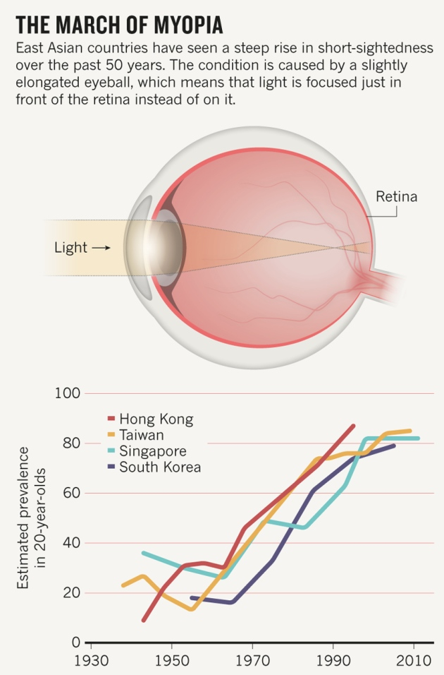 Myopia progression occurs as the child grows and their eyeballs lengthen. The child’s eyes can become larger and longer creating the need for stronger and stronger eyeglasses. Over the last decade, myopia has been identified as an epidemic throughout the world. Researchers predict that half of the world’s population will be nearsighted by the year 2050! The causes are thought to be stemming from several factors including a family history of myopia, decreased exposure to sunlight throughout childhood, increased time spent on near work and electronics, and East Asian descent. In addition to the loss of distance vision, there are increased eye health risks that present as a result of having eyes that are too long. These risks include sight-threatening conditions such as glaucoma and retinal detachments.